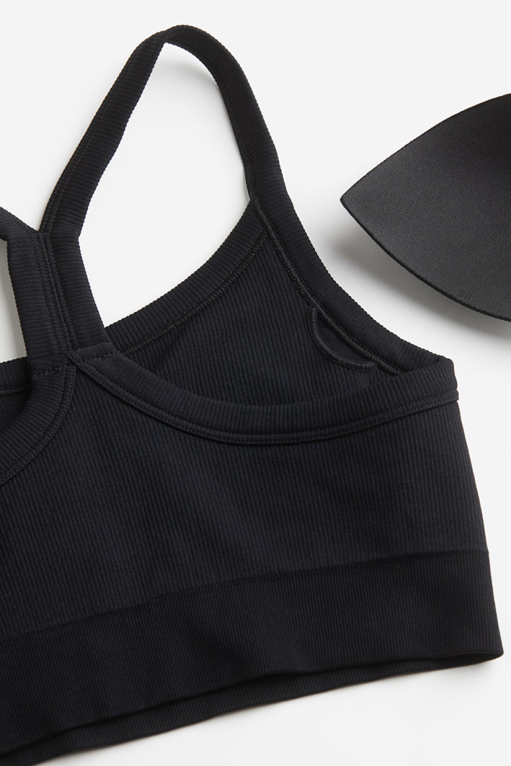 Racerback sports bra in ribbed DryMove functional fabric to wick away moisture from skin and keep you comfortably dry while moving. Narrow shoulder straps, lined cups with removable inserts for shaping and adjustable fit, and ribbed elastic at lower edge. Medium support, suitable for moderate-intensity workouts. Designed with a minimum number of seams for added comfort and increased freedom of movement.