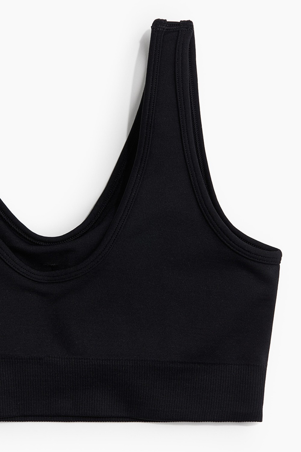 Sports bra in ribbed jersey. Shoulder straps, rounded neckline, and lined cups with removable inserts for shaping and adjustable fit. Wide ribbing at lower edge. Light support, suitable for low-intensity workouts. Designed with minimal seams for added comfort and increased freedom of movement.