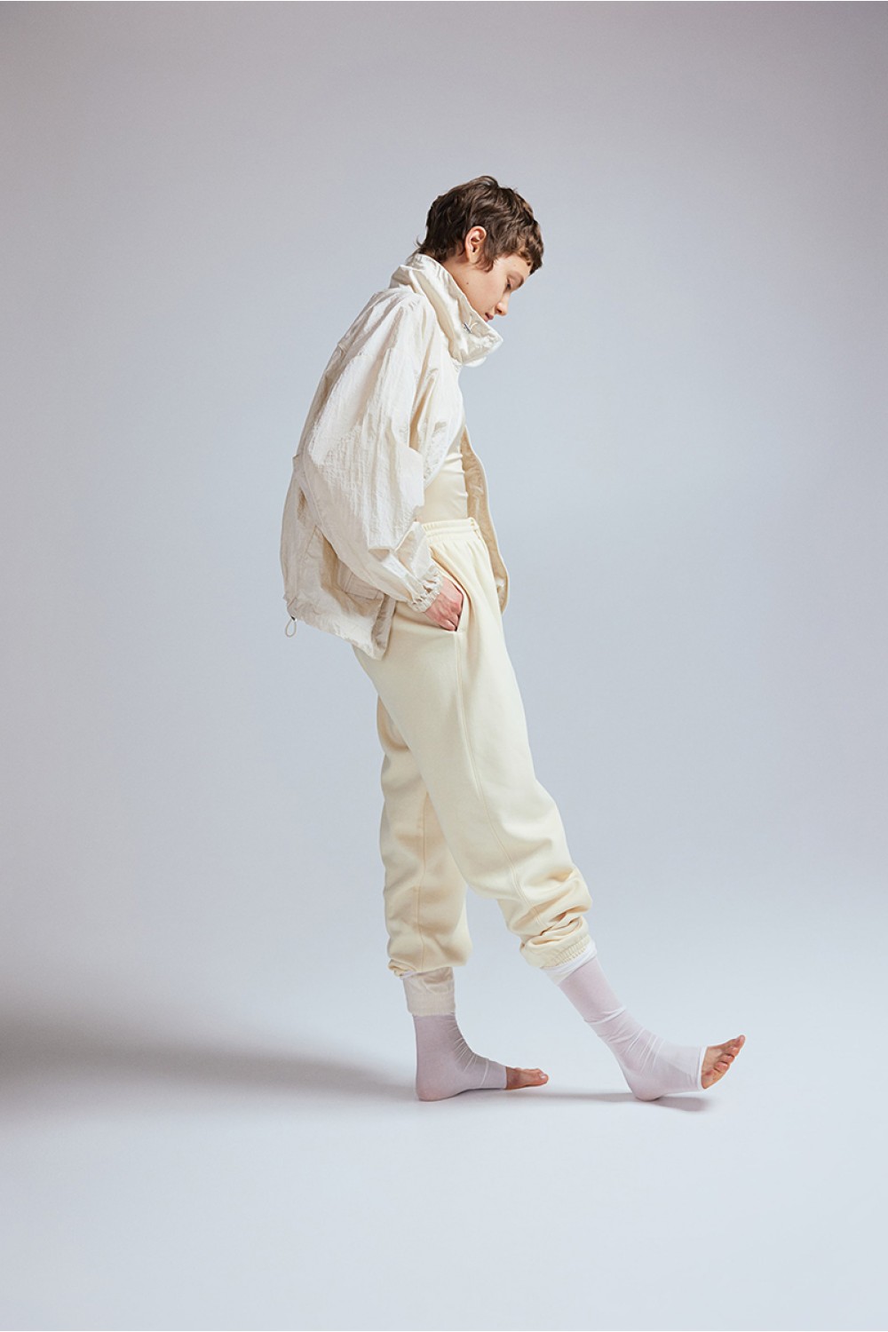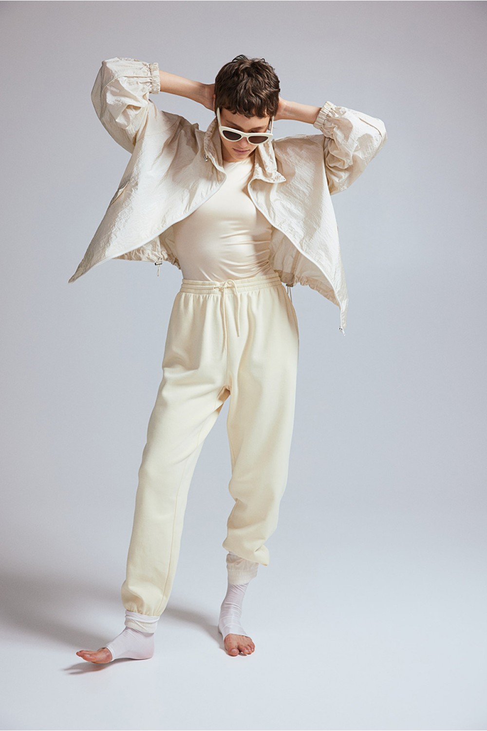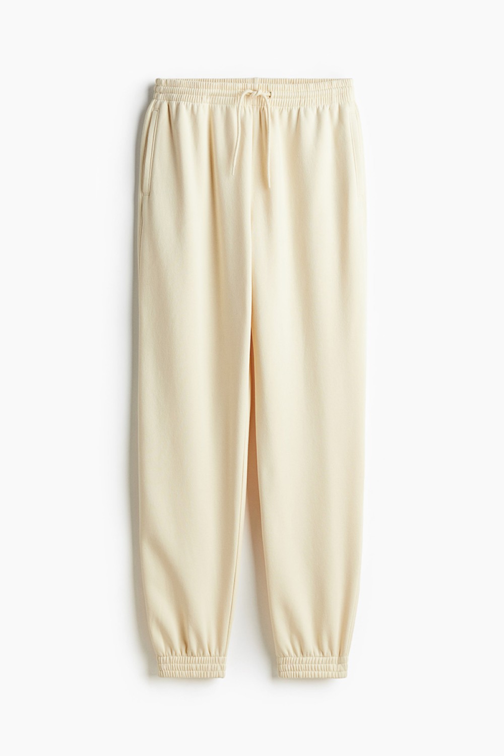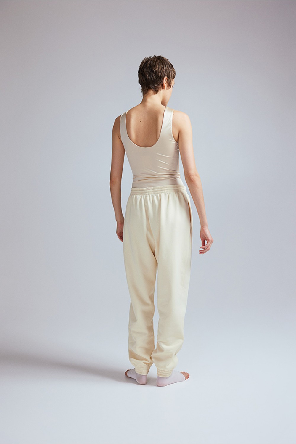 Sweatpant joggers in soft fabric. High waist, drawstring waistband with smocked elastic, and side pockets. Gently tapered legs with smocked elastic at hems.