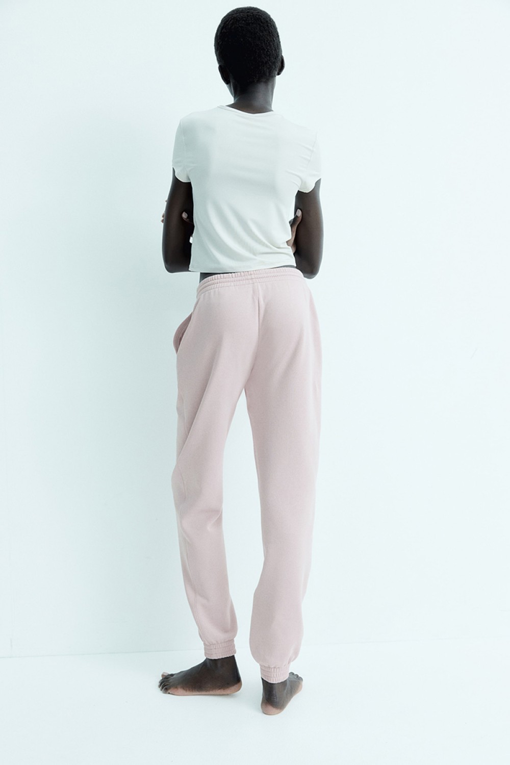Sweatpant joggers in soft fabric. High waist, drawstring waistband with smocked elastic, and side pockets. Gently tapered legs with smocked elastic at hems.