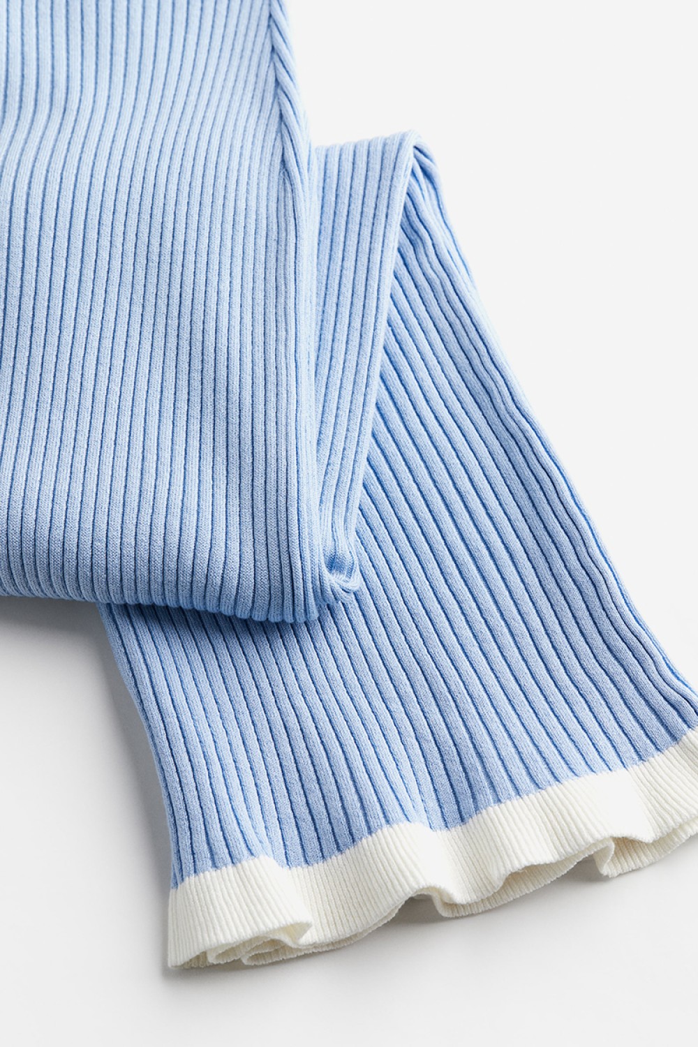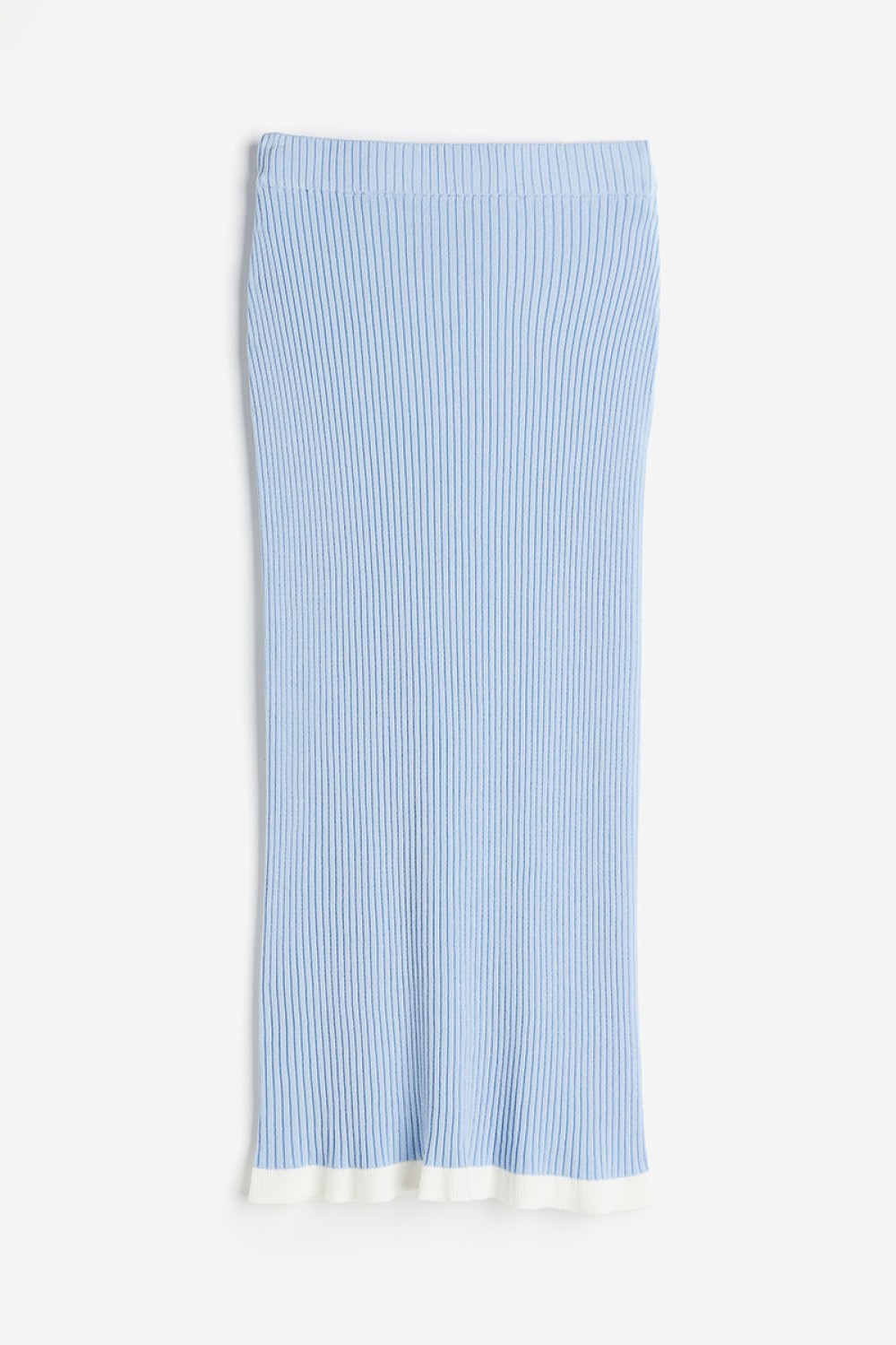 Long, fitted skirt in a soft rib knit. Covered elastic at waistband and a small, contrasting ruffle at hem.