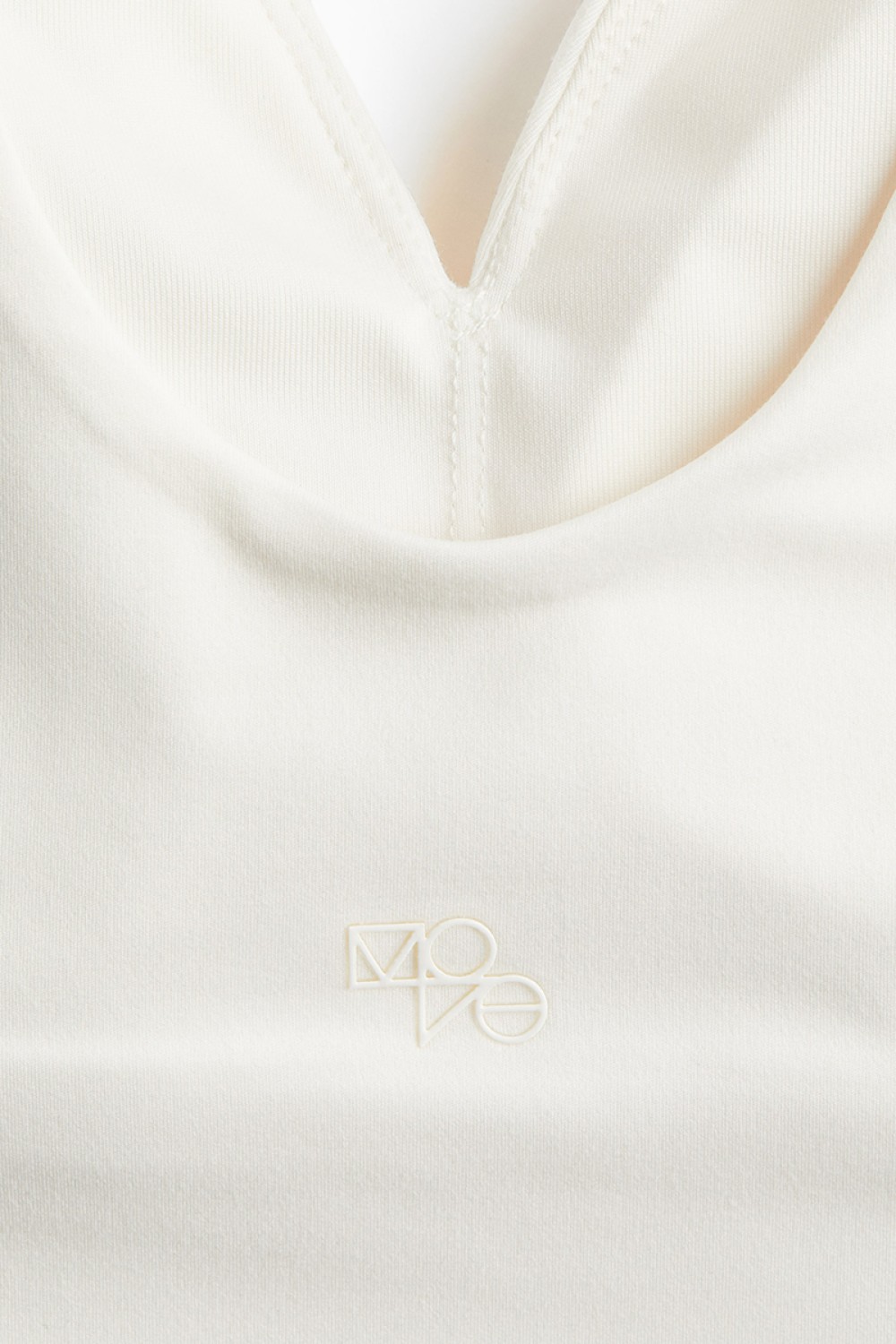 Sports bra in DryMove functional fabric to wick away moisture from skin and supersoft, lightweight SoftMove functional fabric for added freedom of movement. Wide shoulder straps, sweetheart neckline, and lined cups with removable inserts for shaping and adjustable fit. Concealed elastic at lower edge. Medium support, suitable for moderate-intensity workouts.