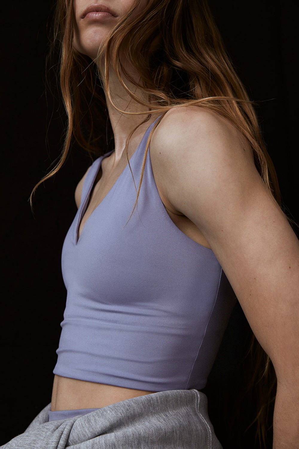 Sports bra in DryMove functional fabric to wick away moisture from skin and supersoft, lightweight SoftMove functional fabric for added freedom of movement. Wide shoulder straps, sweetheart neckline, and lined cups with removable inserts for shaping and adjustable fit. Concealed elastic at lower edge. Medium support, suitable for moderate-intensity workouts.